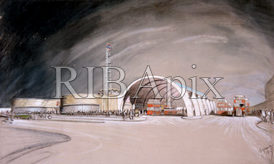 The bus station/shelter is actually an orphan, which explains why it stands in such stark contrast to its immediate surroundings. It’s immediately adjacent to Newbury Park tube station, and there was originally a much larger plan to rebuild the tube station to form an integrated modernist interchange with the bus station. But it never happened, presumably because the money wasn’t there in a time of austerity, leaving the bus structure standing in splendid architectural isolation. The Royal Institute of British Architects’ website has some lovely black and white photos of the bus station when built, and a copy of the artist’s impression of the original design for the interchange. RIBA says I can reuse the tiny versions of the pictures for educational purposes, so here goes:
