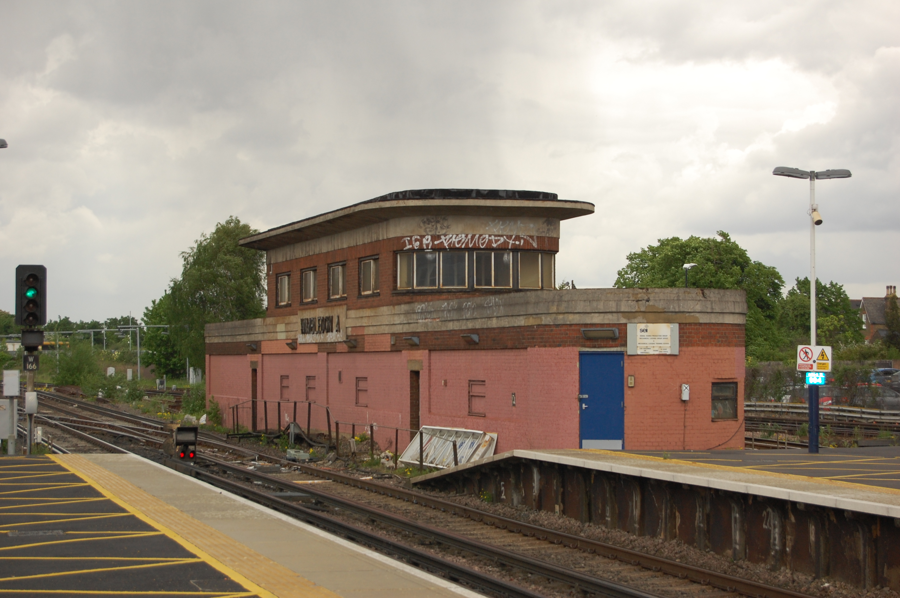 But this week, I think we’ll go to Wimbledon, in south west London. The station’s main building was constructed in the late 1920s to a restrained (and, to be honest, not very remarkable) Art Deco design executed in Portland Stone. It’s not the entrance that’s actually the interesting thing about Wimbledon station. Nor is it the fact that Wimbledon station is served by London Underground, South West Trains, First Capital Connect and London Tramlink services, all at the same level on adjoining platforms. It is that the Wimbledon commuter, no matter how cold, wet or windy their wait on the platform is, can revel in the sight of a beautiful piece of Streamline Moderne architecture while they wait for their train or tram. At the north end of platforms 7 & 8, ladies and gentlemen, I give you Wimbledon “A” signal box.