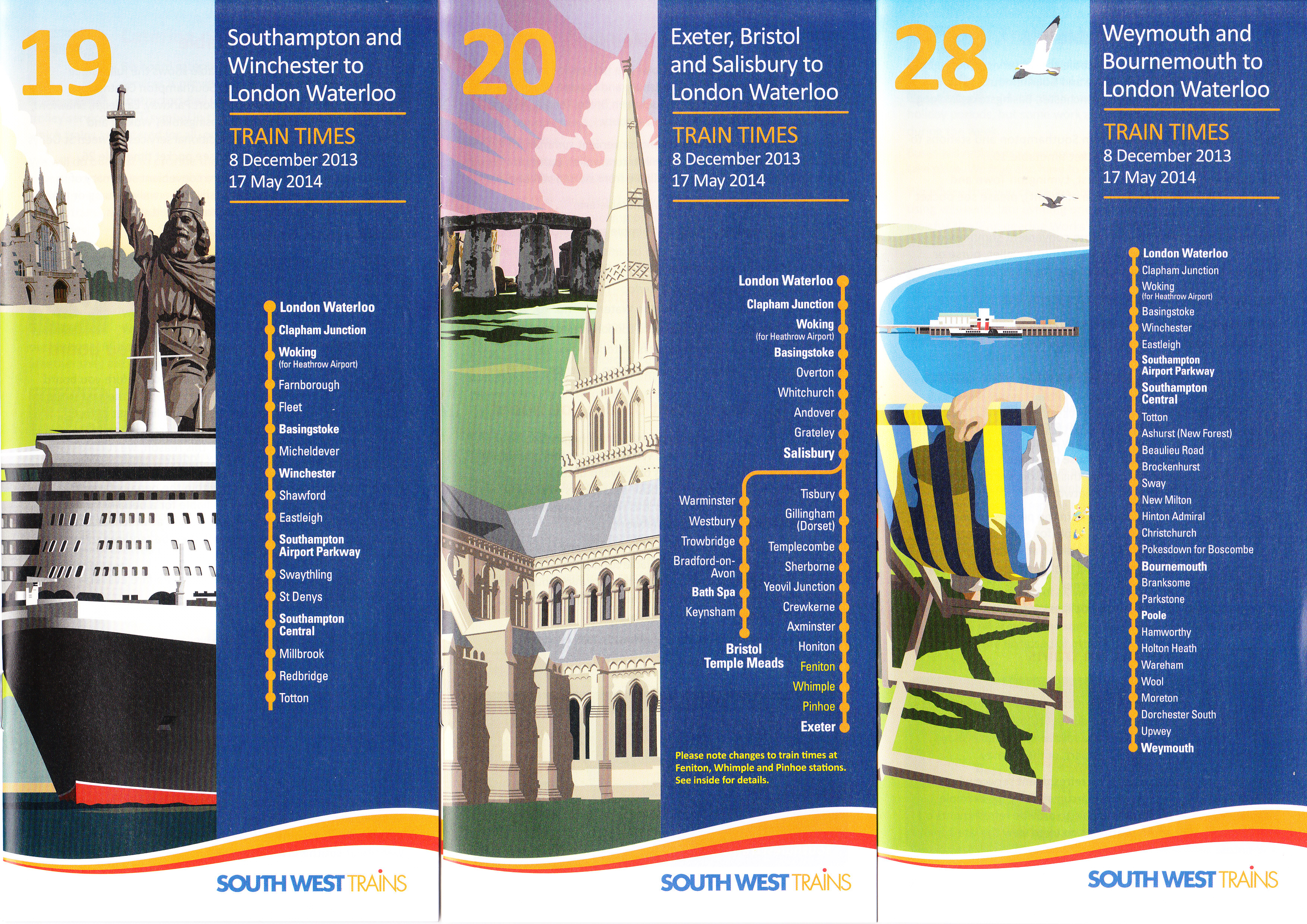 After my earlier post, I got a Tweet from Tandem Design of Southampton, UK, which turns out to be the graphic design company responsible for the front covers of the South West Trains timetables. You can see a selection of others via their Portfolio page here (scroll down until you find the South West Trains Design for Print section or just click here to get to the gallery directly). The company has done quite a lot of poster work for South West Trains too, including some simply gorgeous illustrations of destinations, reminiscent of railway posters of the early to mid twentieth century (the same portfolio page, but this time you want the Transport Illustration gallery, images 4, 5 and 6). The company’s work for Isle of Wight-based bus operator Southern Vectis (see it here, especially the first image in the gallery) also provides the bus industry with a rare example of an attractive timetable booklet that might conceivably catch the eye of passers-by and generate some discretionary travel.