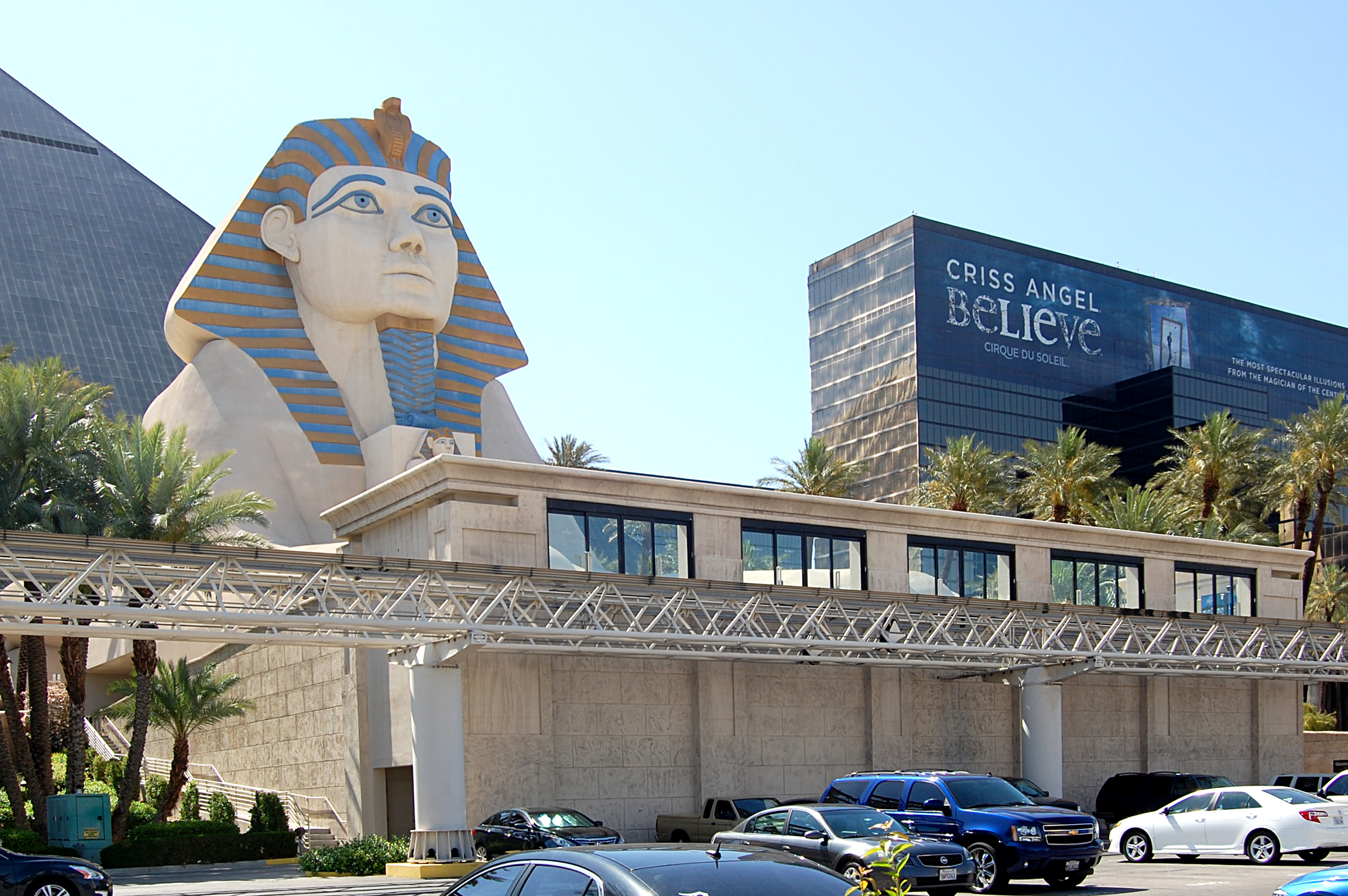Having already travelled into an imaginary mediaeval era, hapless travellers now find themselves in a sort of Ancient Egypt, although to the best of my knowledge Egyptians of the Pharaonic period didn’t cover their pyramids in mirror glass, nor mount the world’s brightest light beam on top, nor stuff them full of gambling tables and visitor attractions. At the paws of a reproduction Sphinx is the vaguely Ancient Egyptian-looking tram stop. Though it resembles a monumental altar of some sort, like Excalibur Hotel station it’s actually just a wall.