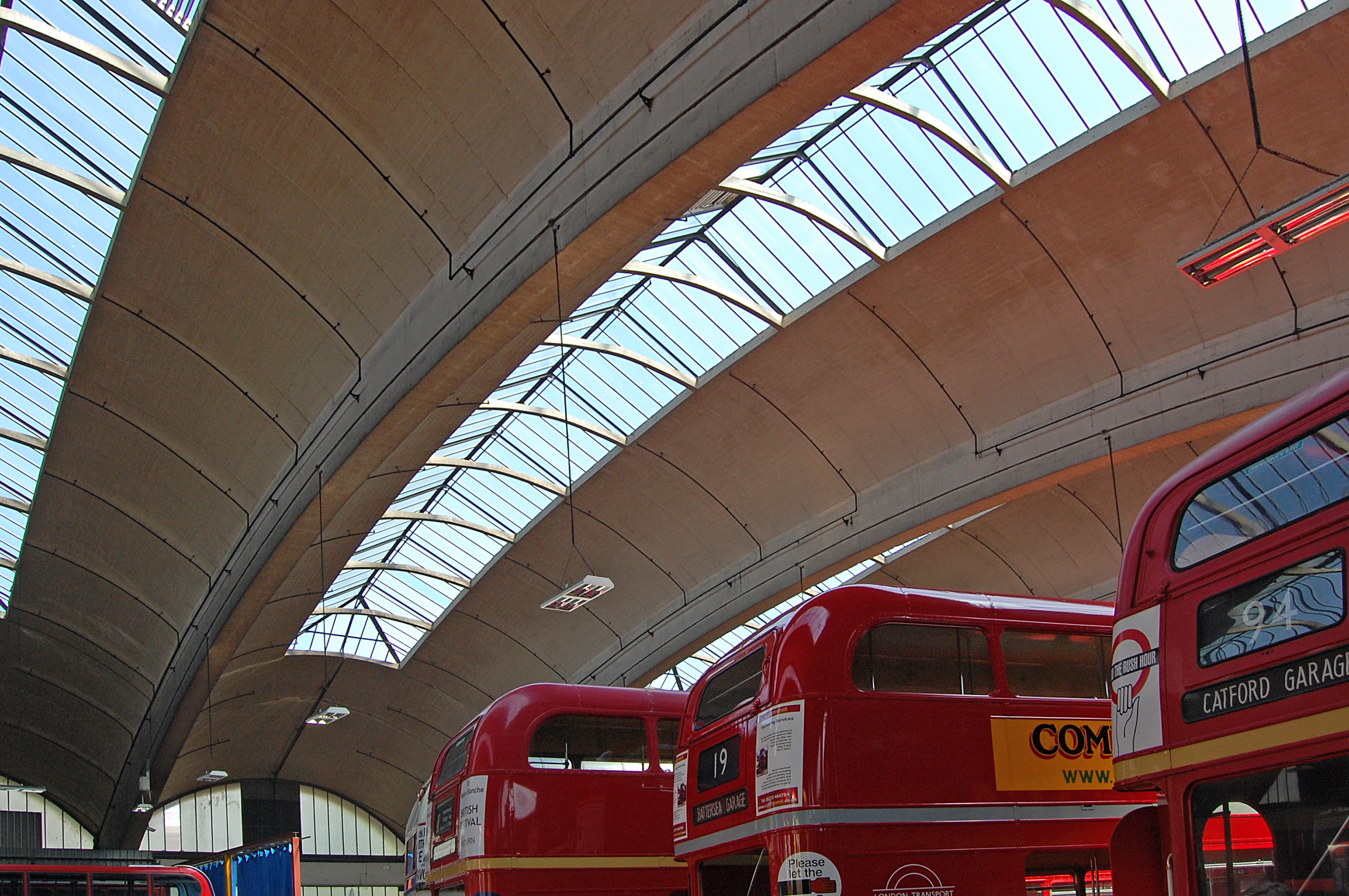 Stockwell Bus Garage is the ideal the beauty of transport building. It is not only quite sensational to behold, but it also performs its job perfectly. It is absolute proof that looking good and working well are not mutually exclusive, that engineering success can be complemented by life-enhancing design; that form and function can co-exist in absolute harmony. When constructed, Stockwell Bus Garage had the largest unsupported area under a single roof in Europe¹. With no intervening pillars, there was a massive floorspace to store buses in a sheltered environment, and easily manouevre them around too. It was also a building appropriate to its era. Its sculptural concrete form was a response to a post-war shortage of steel, a disadvantage which architects Adie, Button and Partners, and A E Beer as engineer, turned splendidly to their advantage in what seems to be the practice’s only transport building. There’s plenty of steel in there, reinforcing the concrete structure, but a lot less than would have been needed to make a traditional building with vertical walls and a pitched roof held together by steel trusses.