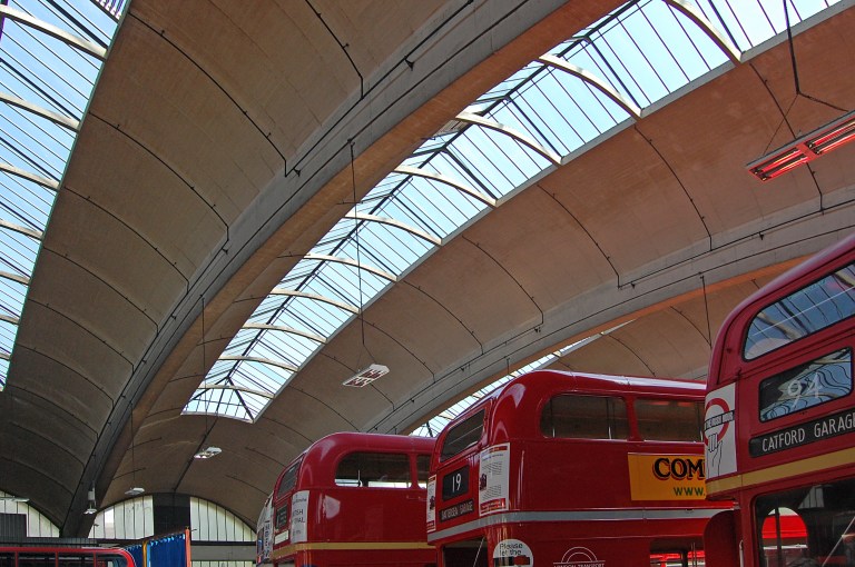 Stockwell bus garage is one of the finest transport buildings in London. No, it’s one of the finest transport buildings in the UK. Actually, it’s probably one of the finest Modernist buildings in the UK, transport or otherwise. Opened in 1952, it is every bit the equal of the pre-war Modernist/Art Deco stations on London Underground. Its vast, soaring roof is a twentieth century match for the nineteenth century trainshed roof at St Pancras, London (UK). Seldom has concrete been so artfully employed, equalling and perhaps even surpassing such gems as Cockfosters Underground station.