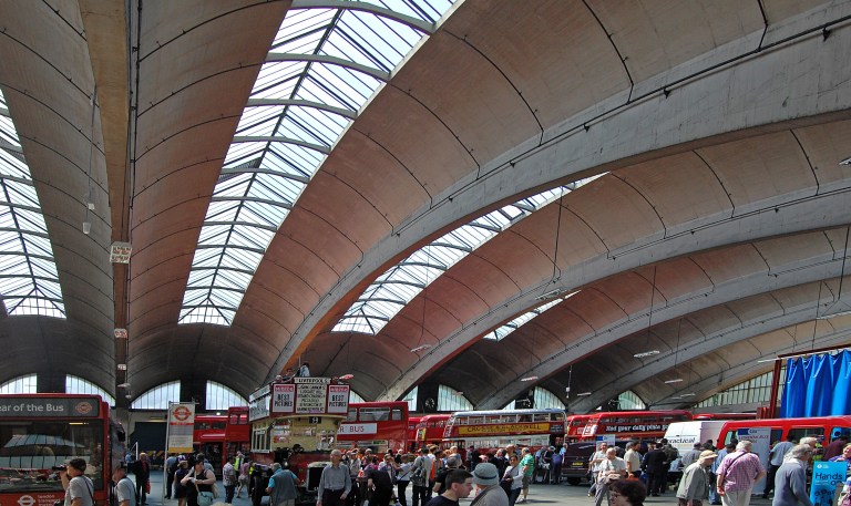 However, Stockwell Bus Garage is to most people completely unknown; this is where it differs from the other buildings mentioned above. Bus stations, bus shelters and bus garages have always played second fiddle in the popularity stakes to railway architecture. It’s (just about) acceptable to express admiration for a piece of railway architecture. Railways are aspirational, used even by the wealthy on occasion. They take bankers to work in the City of London, and get to do glamorous things like run at high speed under the English Channel, linking capital cities far more efficiently than aeroplanes or road transport ever could. Buses are, well, the poor relation. They’re perceived as being for the financially challenged, the socially excluded, those for whom no other transport options are available. (And I say that as a proud bus user myself. I’ve just got a smart card ticket for my local bus network, and I’m excited beyond reasonable measure…)