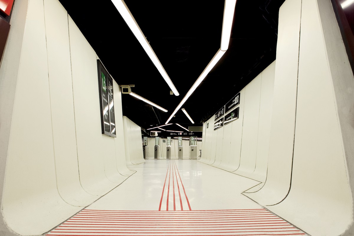The only part of Drassanes station that doesn’t conform to the sleek white aesthetic is the cross-passage underneath the platforms. Here, there was insufficient space to use the reinforced concrete panels, so steel panelling was used instead². It is cut into a wild pattern of different shapes and finished in shades of red and orange (red being the complementary colour to the green elements used elsewhere in the station design; green is the colour of line 3 on the Barcelona Metro map). The divides separating the panels, not to mention the angle-pattern lighting strips elsewhere in the station, are intended to represent intersecting passenger movements. “Were the passengers comets, their trails would weave together, paths crossing at the station,” says ON-A¹.