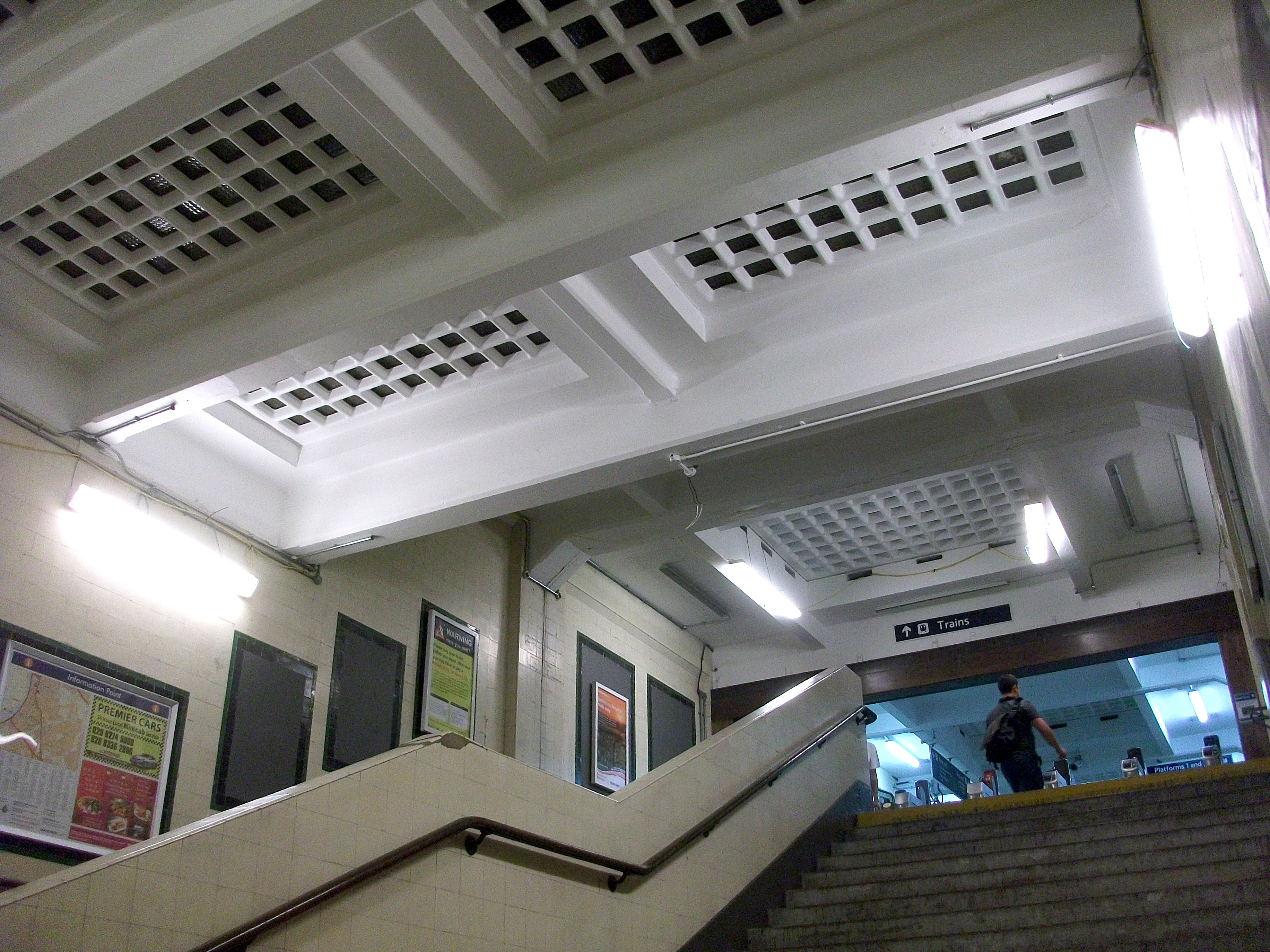 On the north side of the station, a large ticket hall is the main feature, flanked at either side by low buildings which curve back to meet long wings, all of which are tied into a whole by a concrete canopy which runs the length of the building. It’s one of those buildings that is better seen in person than represented in pictures. You can’t really get a clean shot of its full width, because it is hemmed in by surrounding buildings and the view is also blocked by street lights, bins and telephone boxes (the ideal viewpoint from which to take a photo would be at a point which is currently occupied by small shop).