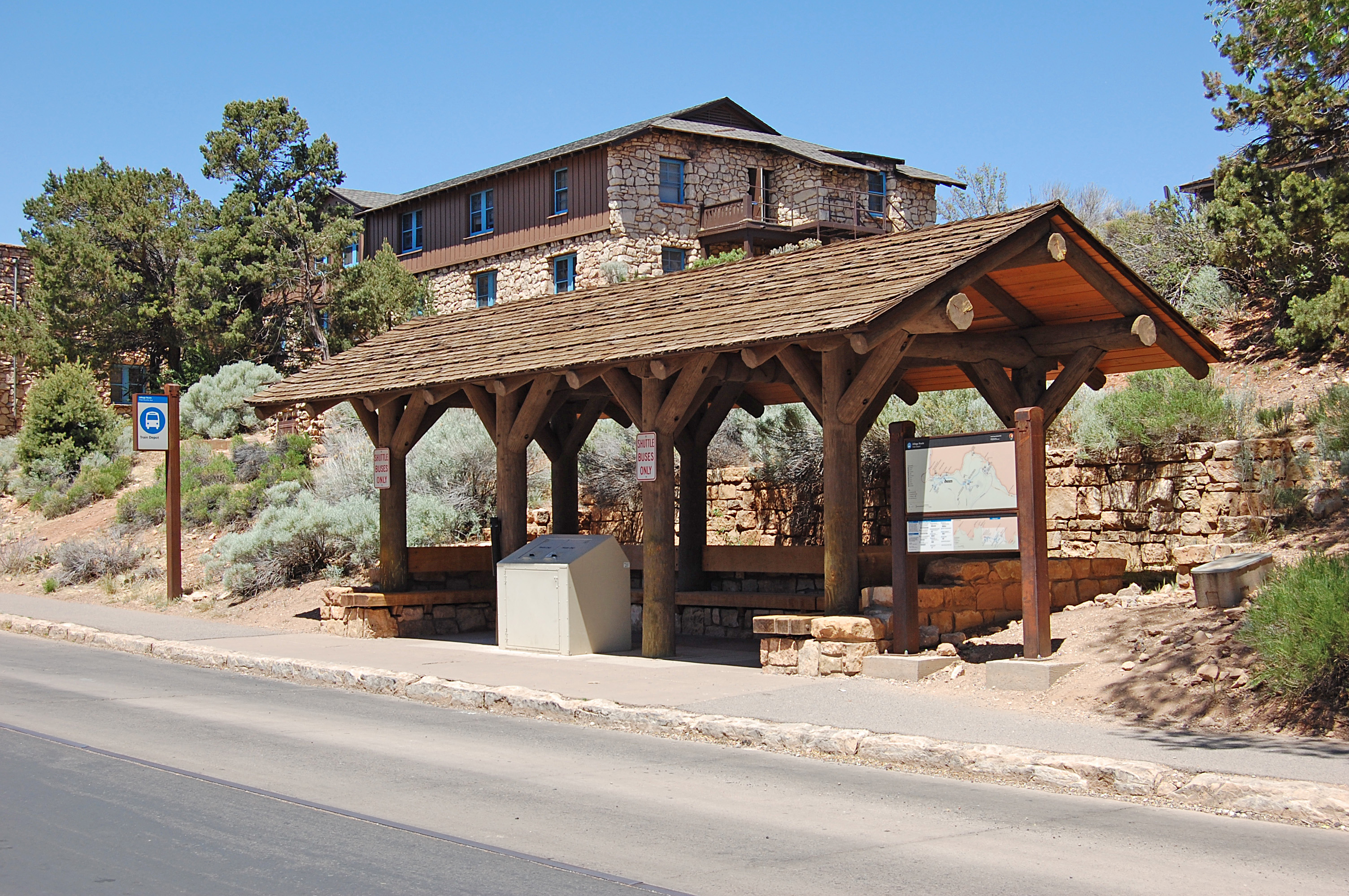 ![Bus shelter opposite Grand Canyon train depot. The branching supports made of logs echo those on the train depot. Photo by Daniel Wright [CC BY-NC-ND 2.0] via this flickr set](https://thebeautyoftransport.com/wp-content/uploads/2014/08/train-depot-bus-stop-grand-canyon-az-27-may-2014.jpg?w=768&h=509)