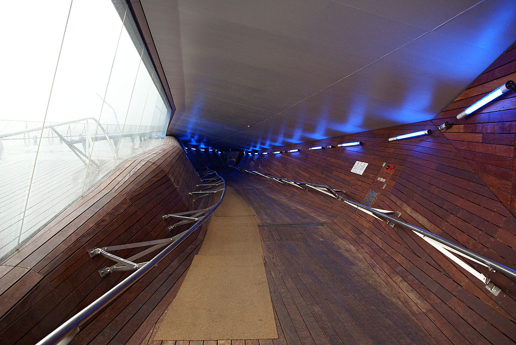 Completed in 2002, the terminal is the work of Foreign Office Architects, and it remains arguably the practice’s most famous building. Osanbashi Pier had been the site of several previous terminals. The previous building, which looks a bit like an upside-down ziggurat, wider at the top than the bottom, is still there but is now used as offices. For the new terminal, Foreign Office Architects was determined to avoid the traditional building-on-a-pier approach which had characterised most port terminal buildings until that time. Instead, it used computer modelling to create a deconstructivist building in which surfaces are intricately folded to create multiple planes at different angles, and the building’s structure flows from one part into the next without particular defining transition points.