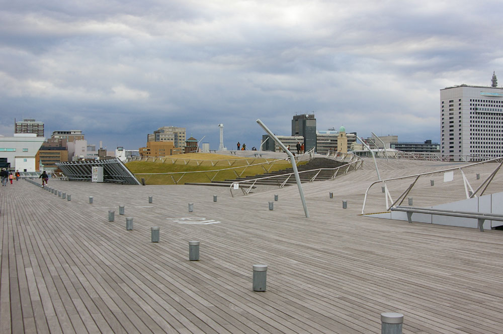 It’s a building of different aspects, presenting varying faces according to how it is being looked at and what it is being used for. On the top (as seen in the photo above) it seems to a visitor like a city park and the fact that it is a three-storey building (two above ground, plus a basement level) is hard to appreciate. Inside the terminal is a series of extraordinary spaces the design of which would have been impossible only a year or two earlier. Yet when approached by ship (it is the major cruise ship terminal for Yokohama) it looks like a more conventional terminal building.