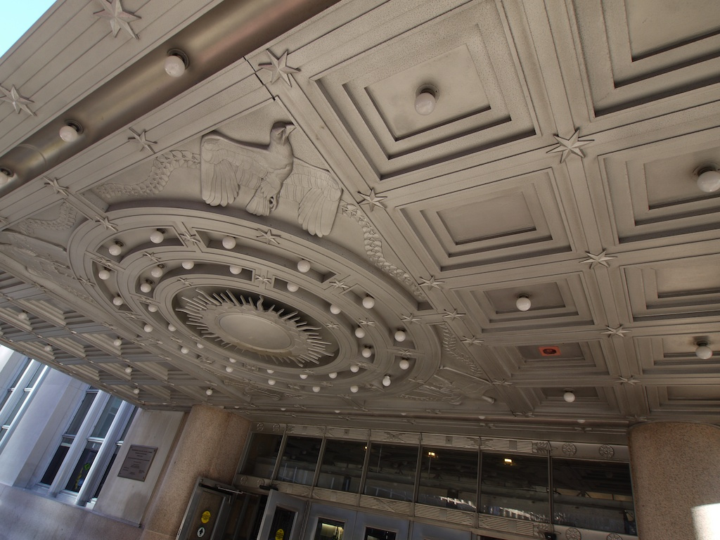 The materials in which Newark Penn Station are finished – limestone with pink granite detailing – are similar to those which faced New York Penn Station. But while New York Penn Station was a neo-classical palace, Newark Penn Station was and is an Art Deco building. Two tall entrance arches (in pink granite) dominate the main façade, one with a clock on the pediment at the top and one with a stylised zodiac motif. This interest in things astronomical and astrological was a recurrent theme in American Art Deco. You can see it on the Chrysler Building (New York, 1930) with sun/star-burst patterns around the base of its spire, and at the Hoover Dam (1936) where the dedication monument features a brass and terrazzo astronomical map rendered with beautiful Art Deco lettering.