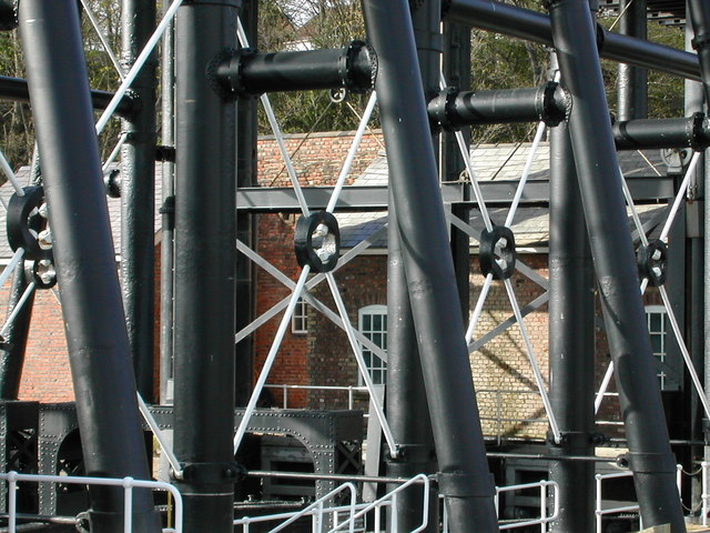 In 1908, the lift was converted to operate on electric power, with the caissons hauled up and down by a system of pulleys and counterweights. This required the construction of a new superstructure around the original, to house the pulley wheels and other bits and bobs, accidentally giving the lift its distinctive tapered cross-section, wider at the bottom than the top. The legs of the new A-frame structure were placed carefully in line with the original structure so that the distinctive and elegant cross-bracing of the original remained easily visible.
