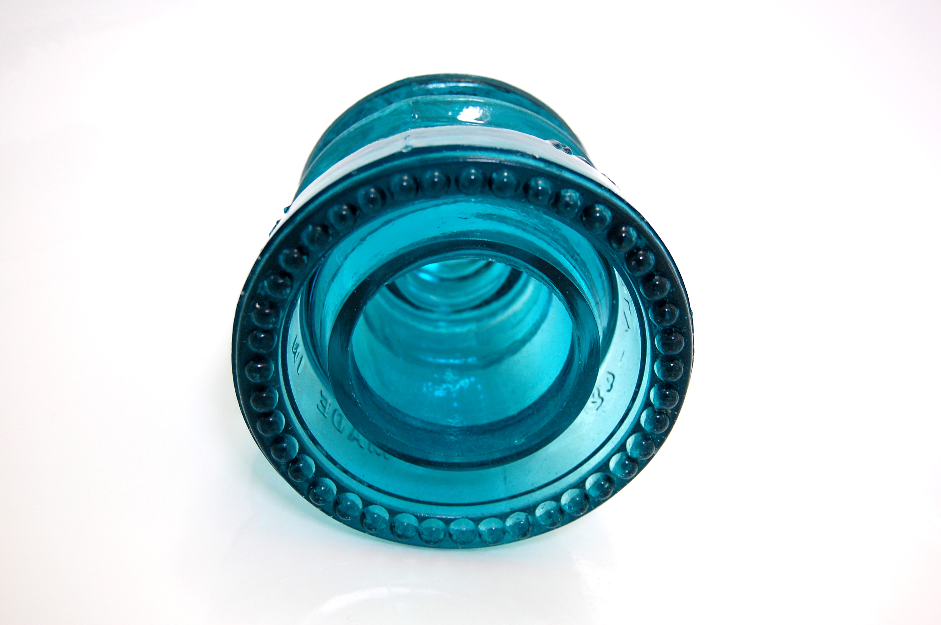 This teal-coloured insulator is a Hemingray 42, produced by the Hemingray Glass Company of Muncie (Indiana). It is one of the most common models of telegraph insulator produced in America, not that its ubiquity detracts from its aesthetic qualities (you can see an online museum dedicated to the Hemingray company here). Like British telegraph insulators it has an inner and outer shed at the bottom (petticoat is the American term) and an air gap between the two. However, unlike British telegraph insulators, there is a ring of Dalek-like moulded hemispheres around the bottom of the insulator. These encourage condensation or rain on the insulator to collect and drip off, drying the insulator faster than it otherwise would, and avoiding current leakage. What a brilliant piece of design.