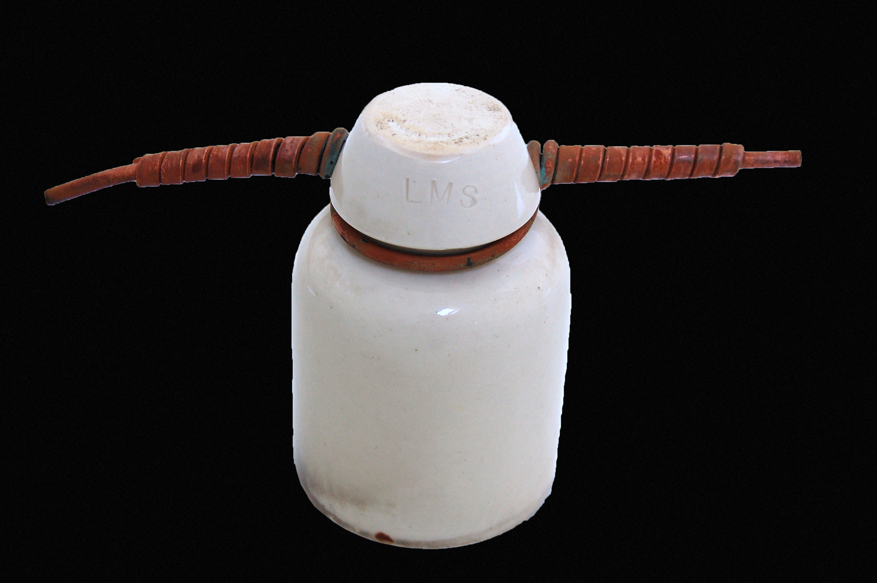 I’ve enthused over the tactile properties of porcelain before, not least in the form of third rail insulators. The item above is an insulator too, although it’s a lot smaller (about 12cm tall). The copper wire is the clue; this is a railway telegraph insulator from the London Midland & Scottish Railway. According to the markings on its top, it is a model number 1, and was manufactured in 1941 by Bullers Ltd.