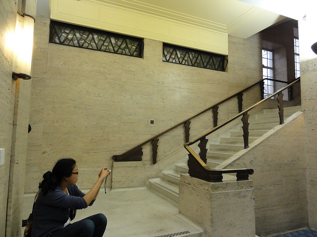 Within 55 Broadway stairs and lifts runs up through the centre of the building, with lobbies on each floor finished in Travertine marble and featuring a ceiling-mounted clock and marble drinking fountain. The main staircase has a bronze handrail with Egyptian-style floral balusters.