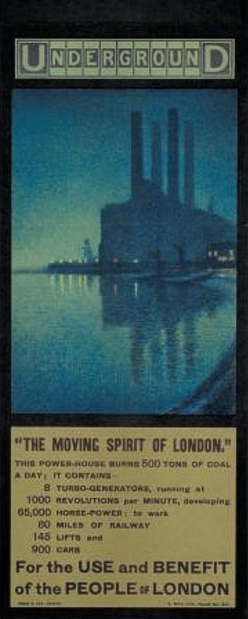 Lots Road Power Station made its way into contemporary advertising artworks for the Underground, where it loomed impressively. Its brooding presence was well captured in this poster, and it contrasts with the playful and exuberant exterior of Bristol’s tramway generating station:
