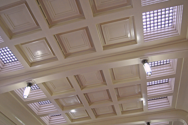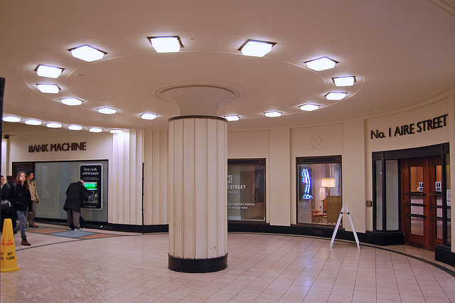 The concourse is seven bays long, divided by buttresses with a gentle curve in profile. It is lit by glass-block skylights in its coffered ceiling, and also by windows in the south-western wall. For night lighting (or rainy Friday afternoons) fabulous Art Deco bronze lamps hang from the ceiling. Along the walls, bronze panels which originally housed ticket counters form the windows for what are now retail units. At one end there is a very stylish clock, while at the other an archway flanked by fluted panels leads into a low arcade. That arcade links to an entrance off City Square, and just within that entrance is this utterly fabulous space: