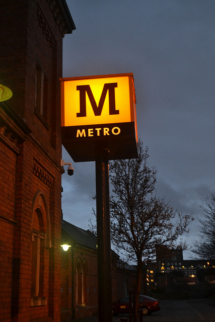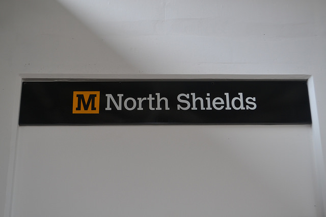 On the technologically trend-setting Sunderland extension (light and heavy rail trains sharing the same tracks), station name signs lost a lot of the impact of the Metro’s visual identity by being finished in white with dark blue/black lettering (I can’t quite tell). Fortunately, the Calvert typeface remained firmly in place on station name signage, and in the form of the yellow/black M on the front and across the side doors of the Metrocars.