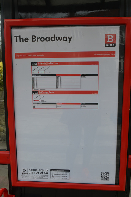 An early move in this direction came in 2006 with the creation of the B-for-buses brandmark (as p92 of this document explains). Matching the layout of the M-for-Metro brandmark, but substituting a Calvert “B” for the “M” and using a red background instead of yellow, it was designed with “the intention of simplifying operator-neutral bus information across Tyne and Wear”, at which it succeeded brilliantly. Not least, I suggest, because it was standing on the shoulders of giants in so doing, by being a direct translation to a different transport mode of a brilliant existing brandmark with a high degree of local comprehension and awareness.