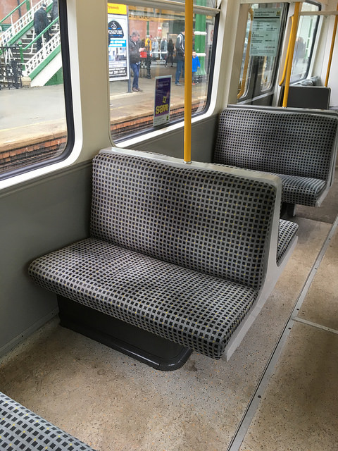 Inside, a smart moquette is mostly grey and black with yellow highlights (replacing the splotchy blue effort seen in this photo). Grey panelling within the vehicles is the unobtrusive background for yellow grabhandles and poles.