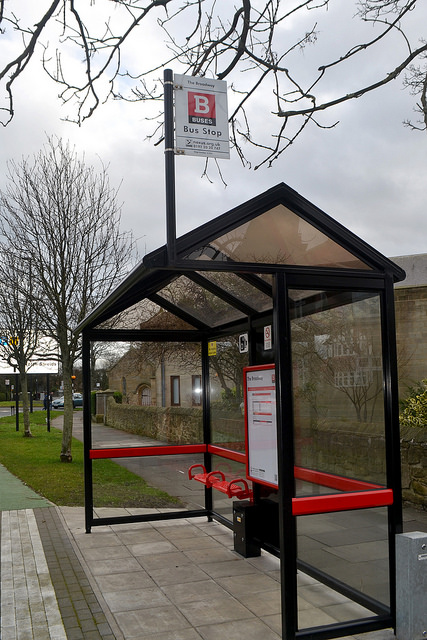 Bus stops are the responsibility of Nexus, not the private sector bus operators. On the bus flags, the Nexus logo has now been demoted to a small black and white version, its place taken by the B brandmark. Where bus shelters are new or refurbished since the Gardiner Richardson makeover, they are black with red highlights, just as the Metro surface stations are black with yellow highlights. Nexus has, however, reserved the use of Calvert lettering for signage to the Metro, and the words on bus stop flags and timetables are set in Futura, Nexus’s other typeface of choice. Frankly, I think that’s a shame and I’d rather have seen Calvert throughout.