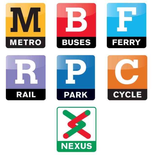 On an orange background, a C brandmark is used for cycles, again seen most often on Nexus’s website (as here) and printed publicity. Nexus has recently been installing smartcard-activated cycle lockers, which would appear to be ideal locations for the installation of physical “C” signage, but as far as I can tell this hasn’t happened so far. The instruction leaflet for the smart cycle lockers carries its C brandmark proudly, however (see it here).