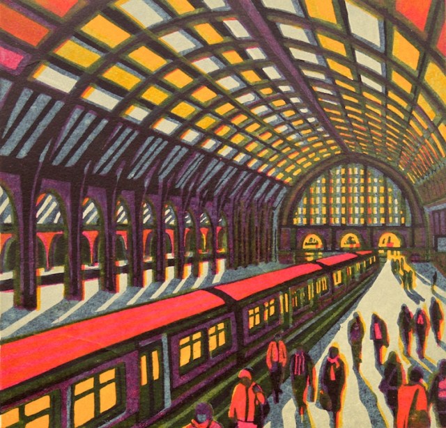 Although she has been a professional artist for about 20 years, I came across her work only a year ago, but was immediately impressed by her atmospheric representations of London’s transport network and its passengers. She works in both paint and linocut, and her work in both media is equally accomplished. She’s just seen a splendid new book of her work published, and there’s a retrospective of her linocut work showing in London. Today, it’s her linocuts I’m concentrating on, because it’s an artistic medium this blog hasn’t featured before.