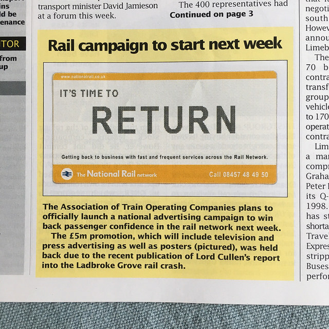 Although there have been various calls over the years since privatisation for a pan-rail industry advertising campaign, not least to combat the fact that the national media loves nothing better than giving the industry a good kicking whenever it can, it has taken the creation of RDG to make those calls a reality. The last campaign of any similar nature took place in 2001, a year after Hatfield. It was commissioned by ATOC to tempt back to the trains passengers who had abandoned the railway in the wake of post-Hatfield chaos. It’s not well-remembered today, probably because it was slightly underwhelming. Produced by McCann-Erickson, it was based on the pictography of train tickets, and the tagline “It’s Time to Return”, a pun probably appreciated more by railway cognoscenti than regular passengers. Here’s an article from Transit (written by me in my transport journalism days) trailing the concept:
