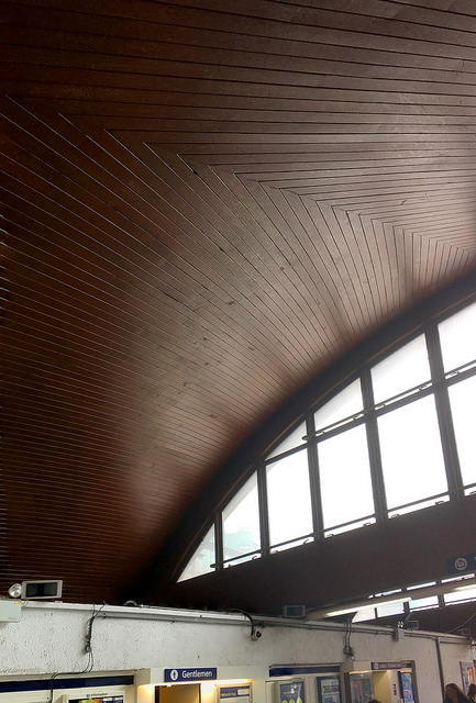 Much of the station’s roof structure is surfaced with hardwood strips, on the outside vertical faces, and on the ceilings inside. The wide ends of the cones are filled with glass windows, which lets plenty of light in, but makes photographing the interior difficult because the light overwhelms the interior detail. Parissien (2001) makes the useful comparison to a building other than Sydney Opera House, pointing out the similarity with the glazing arrangements at the TWA Flight Center at JFK Airport in New York.