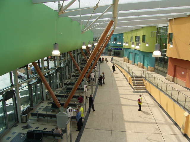 Barnsley Interchange is just as good, but takes a distinctive and completely different approach. It is dominated by the part of the building which function as its bus station. It takes the form of an enclosed street, something it has something in common with the arguably never-bettered Nils Ericson bus and coach station in Gothenburg, Sweden. Along one side of the internal street is a series of curvy, organically shaped buildings, finished in bright colours. Sky blue, yellow, orange and lime green predominate on the exteriors. They house retail units including a newsagent and food outlets; things you’d find useful at a public transport interchange, in other words. They also contain offices and meeting rooms. There’s a cycle hub at the interchange too, just for good sustainable transport measure.
