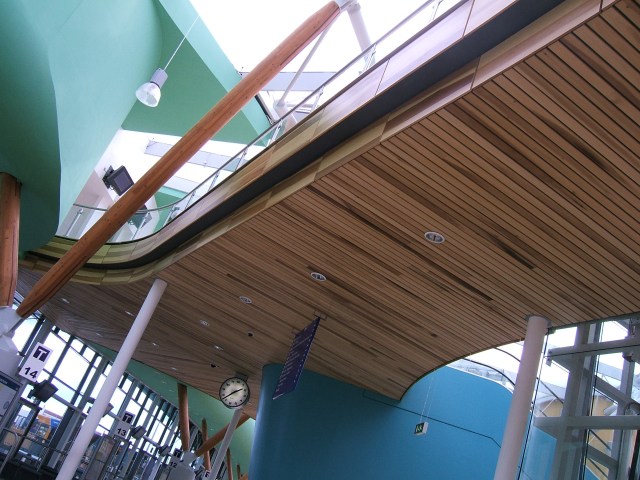 The inside of the bus station is remarkably light and airy, thanks to a transparent ETFE roof supported on V-shaped wooden struts. The central part of the building, where the escalators lead up to the footbridge, is the location of the principal entrance to the interchange. Here, the roof curves down and makes a dramatic shape over the doors. There are other entrances to the interchange’s bus station, where extended canopies are clad in copper. Copper covers all the non-transparent parts of the roof, not least because it proved suitable for moulding to the complex curves of the interchange’s design.