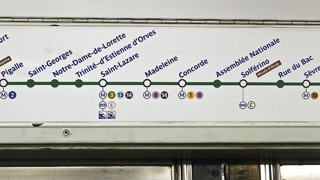 With its mix of upper and lower case lettering, it has the friendliness that intimidating upper case-only typefaces like Métro Alphabet lack. It is a distinctly svelte-looking typeface, with some stylish touches that seem appropriately Parisien, such as a looped ‘g’ rather than the simple curved descender of a Helvetica ‘g’. Indeed it is Helvetica with which Parisine is compared by typeface company Typofonderie (which Porchez founded); not surprising given that Parisine was designed as a superior replacement for Neue Helvetica. Compared to Helvetica, Parisine has stronger terminals, better proportions and more legible numerals, says Typofonderie. Its letters are fairly narrow, and this helps fit in some of the longer station names.