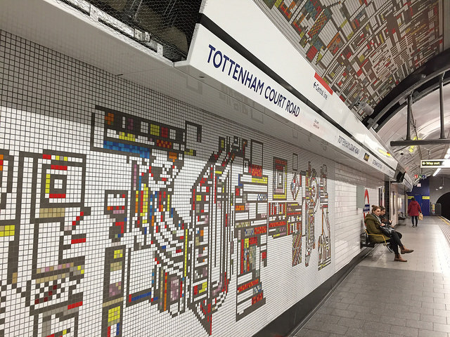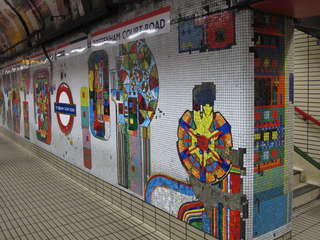 The station’s ticket office originally featured a large mural at the top of the escalator shaft, and there was another mural at the entrance from Oxford Street. Both would be lost in the station’s Crossrail-related reconstruction and refurbishment, which included a massive expansion of the ticket hall. Announced in 2014, the loss of these works was met with petitions to save the murals being signed by thousands of people, and a lot of bad press for Transport for London (TfL). London newspaper the Evening Standard frequently reported on the story. While the Twentieth Century Society demanded urgent talks with TfL January 2015 over the fate of the two murals, in February 2015 the Evening Standard reported that the escalator shaft murals had already been dismantled and lost. The Twentieth Century Society did, however, get an agreement from TfL that the Oxford Street entrance mural would be relocated within the station.