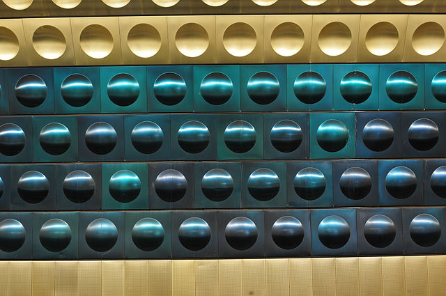 Although it is the variations in colour which are the most striking difference between the stations, there are detail differences too. The panels are most often seen arranged in a grid pattern, but those at Muzeum and Malostranská, for instance, are spaced out by intermediate acoustic damping panels (like pegboard in appearance, if you are old enough to remember it) and the hemisphere panels are arranged in a staggered, brickwork-like pattern instead.