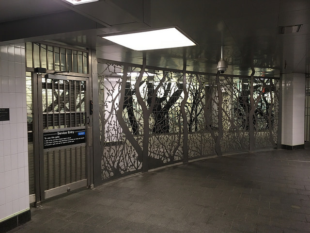 I also admired the “See it Split, See it Change” artwork at Whitehall St-South Ferry station, which takes the steel fences common in Subway stations, separating the ticketed areas from the non-ticketed areas, and does something really interesting with them.