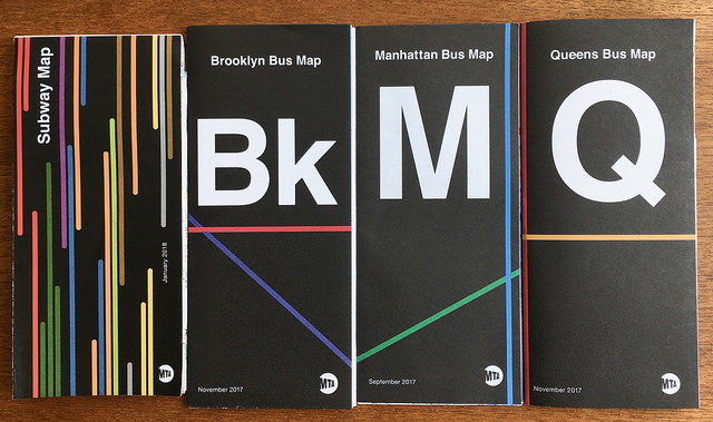 Helvetica is cool, clear and calm, in stark contrast to the Subway itself. Despite its recent introduction, it has firmly established itself as part of New York’s urban scenery. Although most of the bus network doesn’t reflect the Subway’s use of signage, where it does (as on the covers of bus maps) it looks very stylish, and very New York.