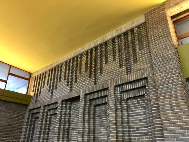 Inside the terminal, brown bricks are again made to form embossed geometric patterns on a startling feature wall.