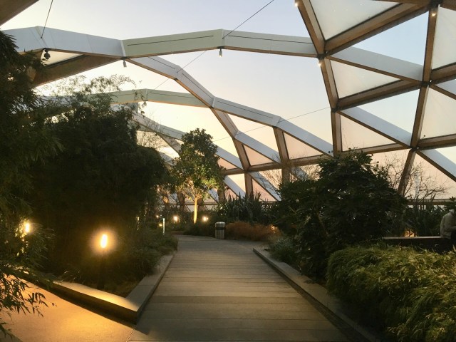 Like Kai Tak Terminal, Crossrail Place has a roof garden, running almost the full length of the building, designed by landscape architects Gillespies. It is partially sheltered by the roof, with some sections protected by the triangular ETFE panels, but left open towards the middle to allow in light and rain for the plants, and again at both ends so that visitors can enjoy the views.