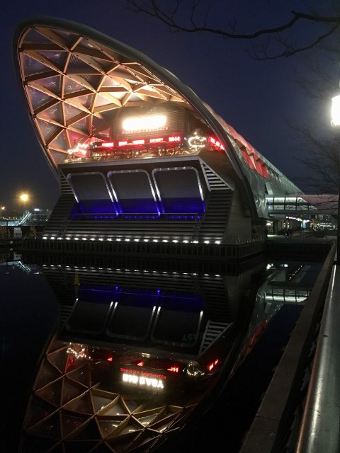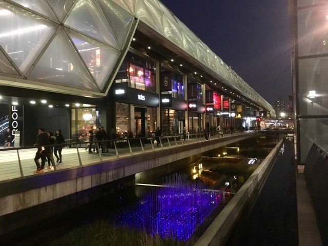 Impressive in the daytime, at night and at dusk, when I visited, it is quite magical. This is no meanly-designed square of lawn passing itself off as a park to get planning permission for a major development. This garden is thoroughly-considered with an impressive planting scheme, where trees from east and west are planted at the east and west ends of the park, as appropriate. Paths wind through the trees and shrubs, and benches are dotted here and there to allow for visitors to take in their surroundings. A sensitive lighting scheme addresses personal security concerns but doesn’t simply flood the garden with flat light from lighting columns. The rest of the building also looks splendid at night, reflected in the dark waters surrounding it. Illuminated sculptures along the south side of the station add visual interest.