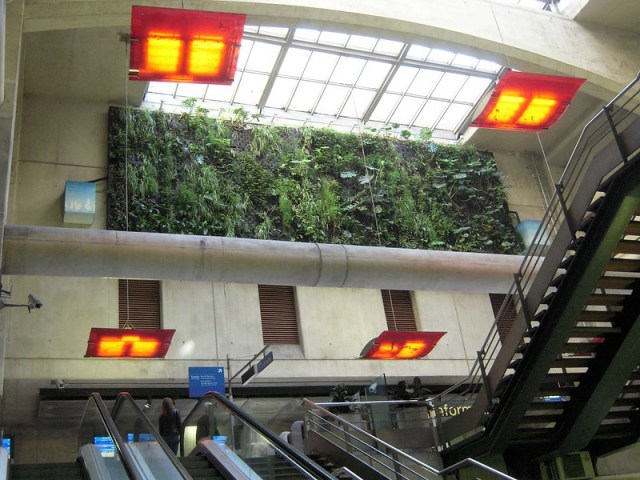 Acoustic panels in the platform ceilings work in harmony with the surrounding colourscape and could be mistaken for decorative elements. Metallic serif lettering informs passengers of where they are. This is also chosen to blend in; perhaps a more contrasting colour would be more helpful from a utilitarian standpoint, but it does suit the environment.