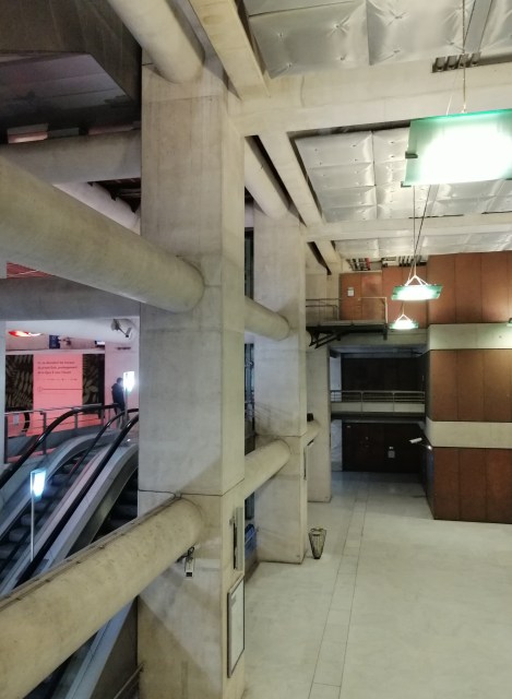 Marble floors complement the concrete walls and ceilings, while light, airy wood and metal staircases contrast nicely with the heavy concrete and overbearing scale. Bridges use an acoustically treated wooden floor resembling the staircases. Unique translucent light shades in red and orange bring warmth to the platforms, while a similar design in green adorns some of the connecting walkways. Glass lifts add to the feeling of spaciousness while respecting the principle of vérité constructive.