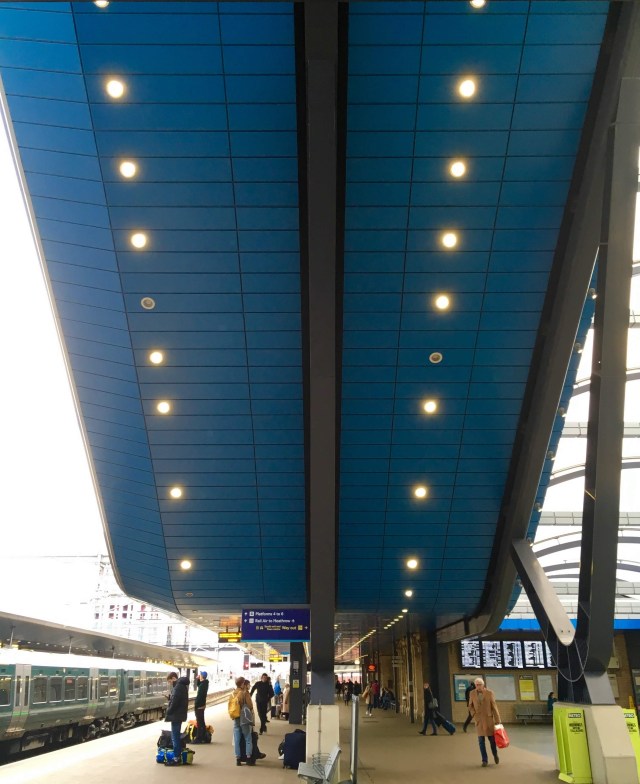 The view out the north side is somewhat spoiled by the unreconstructed multi-story car park used for railway dropoffs and pickups which were not integrated into the redesign. The ideal response would have been to provision dropoffs/pickups and local buses into a structure that provides some weather protection all the way from motor vehicle of choice into the station building, instead of across an unprotected and sometimes windy open space (which seems to lack any other utility, not even an occasional market–would be a good place for a small seasonal Christmas market)