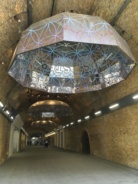 Grimshaw’s reconstruction of London Bridge allowed Network Rail to become a better neighbour in the area, by addressing the problems of severance the old station caused. To get from one side of the station to the other before the rebuild involved a frankly terrifying walk along narrow pavements in one of the roads which ran under the station. The reconstruction saw Stainer and Weston Streets incorporated into the new concourse and Stainer Street in particular transformed into a publicly accessible walkway from north to south. It hosts a major piece of public art, “Me. Here. Now.” by Mark Titchner, a series of umbrella-like mirrored steel domes suspended from the ceiling. Other pieces of temporary artwork have also found themselves a home at London Bridge from time to time. It’s now the sort of space that lends itself to such uses.