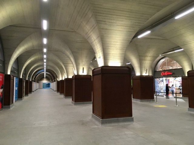 London Bridge’s new concourse links to London Underground’s London Bridge station entrance via the attractive Western Arcade. Historically the site of a market, it had been been remodelled relatively recently in railway terms, when a new link was formed through it between the Underground and the mainline station as part of the Jubilee Line Extension works in the late 1990s. Now remodelled again and extended, the original brick vaults remain at the western end of the arcade with their bases protected by pale concrete enclosures. Brand new vaulting at the eastern end of the arcade mirrors the shape of the original vaulting but with the colours reversed as pale concrete uppers with a shuttered finish have bases made of darker corten steel. The Western Arcade is now lined with shops (as well as housing the station toilets) and is just about big enough for the double duty it serves as retail space and busy pedestrian link between National Rail services and those of London Underground.