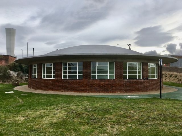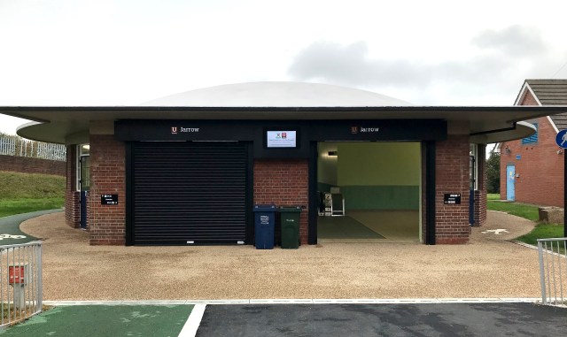 Like the Greenwich and Woolwich Foot Tunnels, the Tyne Pedestrian and Cyclist Tunnels is served by two circular rotundas, on the north bank at Howdon and the south bank at Jarrow. They are built of red brick (like the entrance buildings at the Greenwich and Woolwich tunnels) and have a double opening at the front. But that is where the similarities end. There is no decorative ironwork on the windows here, just stylish large windows with Crittall-style frames. Rather than the glass domes at Greenwich or the copper cones at Woolwich, the rotundas for the Tyne Pedestrian and Cyclist Tunnel are capped with splendid thin shell concrete and asphalt dome roofs, which Historic England likens to the much less enduring Dome of Discovery.