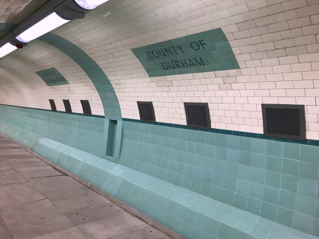 Perhaps the most famous bit of tiling in the tunnel is at the halfway mark in each bore. There, at the old border between Northumberland and Durham counties, is a vertical strip of green tiling and either side, decorated tiles which read “County of Northumberland” and “County of Durham”, just so you know where you are.
