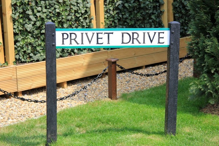 The film opens with an owl sitting atop the street name sign for Privet Drive – the road on which the eponymous wizard child has been growing up since he became orphaned – set in Kindersley MOT. A reproduction of the same sign (this one has gained unusual green stripes top and bottom), again set in Kindersley MOT, can be found at the Warner Bros. Studio Tour in Watford.