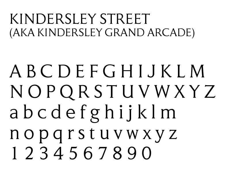 There is the Kindersley Alphabet, a serif letterform, which was designed by David Kindersley specifically for street signs in Cambridge, but not adopted by the borough initially. This is what has been revised and revived as Kindersley Street / Kindersley Grand Arcade, and is the lettering seen on many street nameplates across the country.