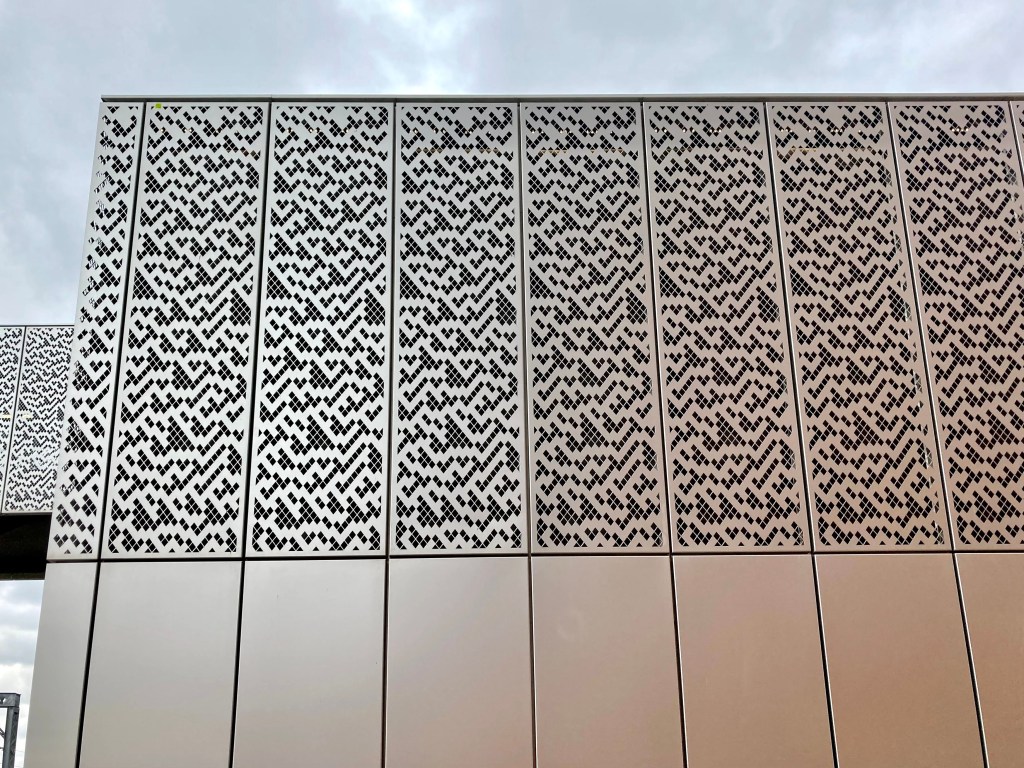 Not unrelated is another side to the pretty pierced aluminium panels. Blissfully unaware until I was told of the ‘directed vision’ psychology behind similar ones such as at the Westfield shopping centre in London’s Shepherds Bush. There the “random” hole pattern is in the ceiling and where the sun shines through.