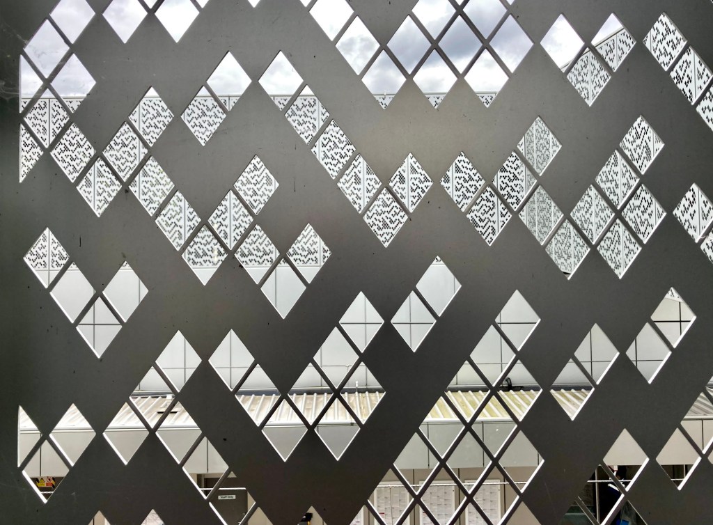 Although many of the aluminium panels are left plain, a substantial number are perforated with an intricate pattern reproduced at either large or small scale, especially (but not exclusively) along passenger routes through the station. The experience of walking through the station is unusual, with views to the outside obtained not through traditional square glass windows, but an array of rhombus-shaped holes.
