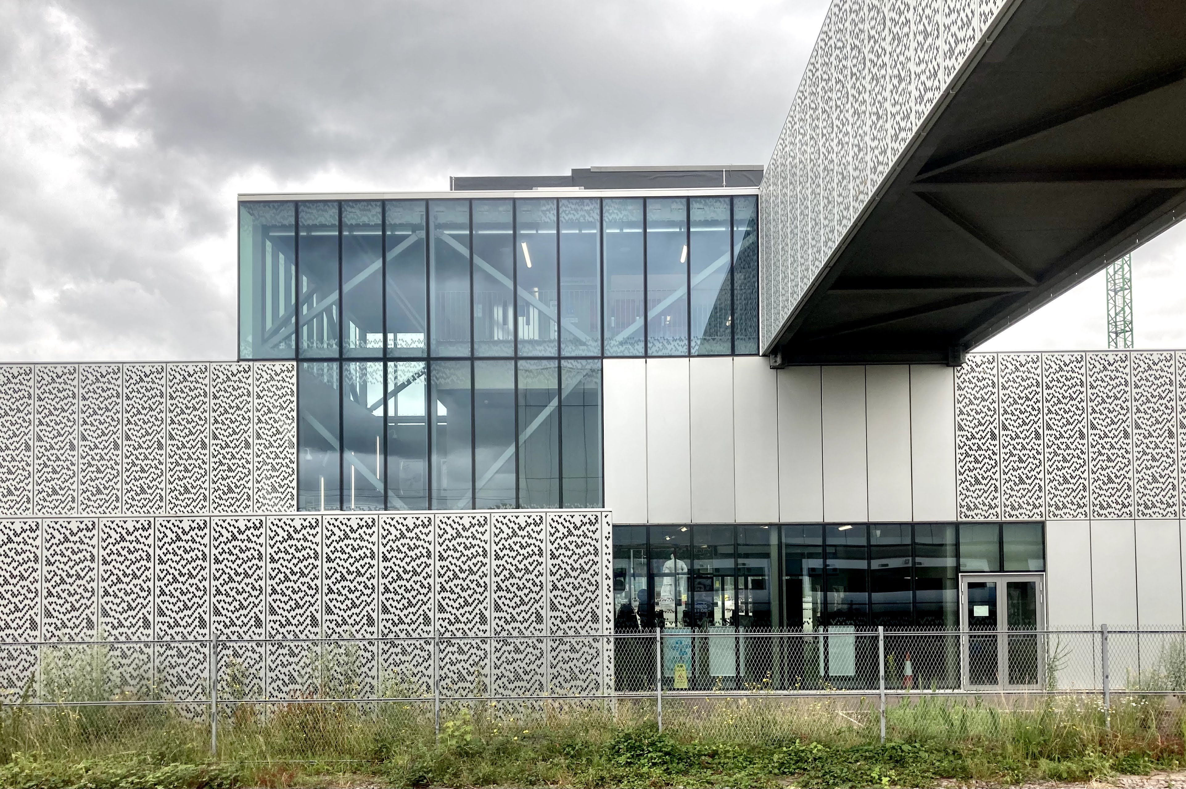 The aluminium panels are in some locations replaced by glazed ones of an identical size, allowing natural light into key passenger areas like the platform waiting rooms, the station entrance, and the upper parts of the main building via a glazed box at the top level.