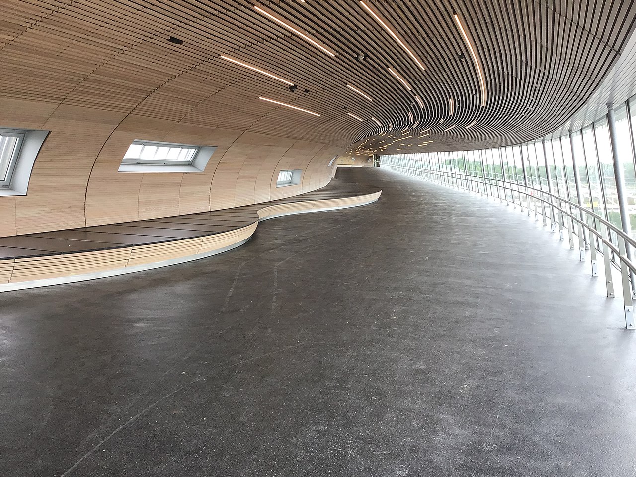 Slatted oak lines the nine metre-wide interior of the footbridge and softens its appearance. It also contains sensitively installed recessed lighting. Seating takes the form of curving integrated benches finished in the same wood which appear to flow out from the interior lining of the footbridge.